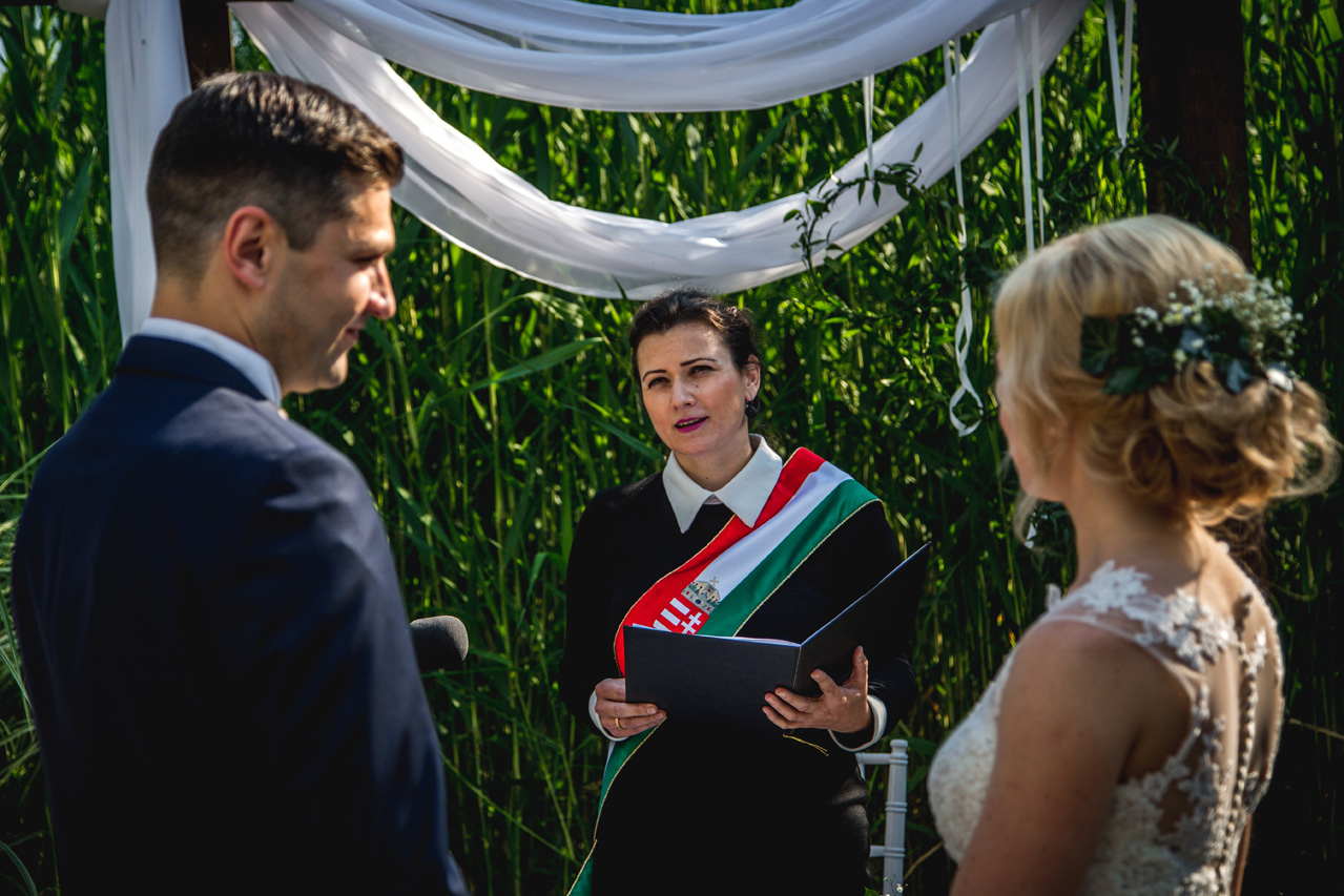 „Esküvőnk fénypontja a csodaszép szertartás volt. Katalin mindenben odafigyelt ránk és olyan szép beszédet állított össze, ami minket tükrözött és a szerelmünket jelenítette meg. Elvarázsolva hallgattuk a vendégeinkkel a kedves és néhol humoros szertartást. Ez a pillanat rólunk szólt. Köszönjük.” Judit és Laci